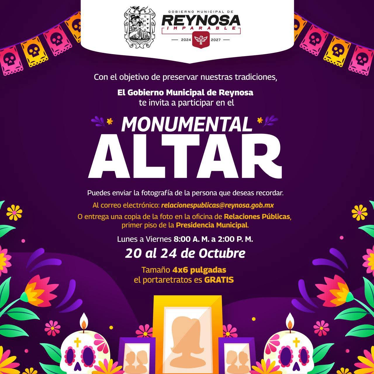 Reynosa, Tamaulipas.-El Presidente Municipal Carlos Peña Ortiz invita a la comunidad a ser parte de la preservación de las tradiciones nacionales, en el Monumental Altar, de la plaza principal Miguel Hidalgo de Reynosa, con el que se celebra a quienes ya no están físicamente con nosotros.