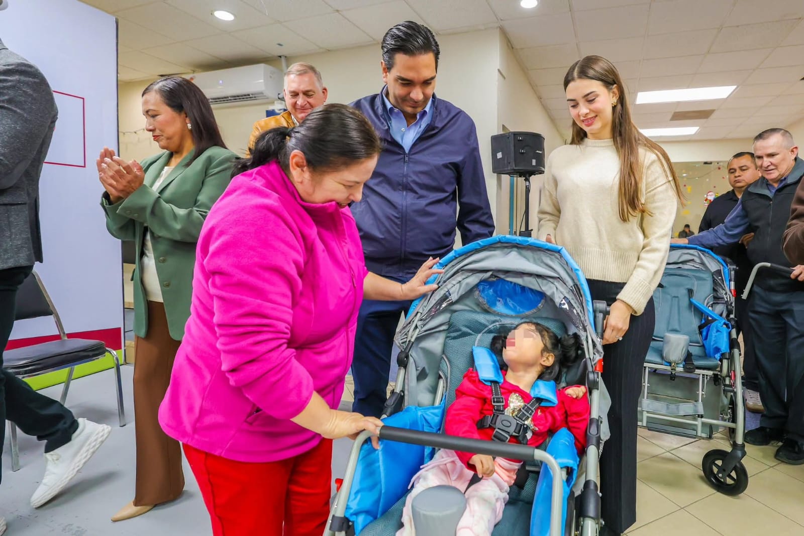 El Alcalde Carlos Peña Ortiz, acompañado por su esposa Alejandra Yelitza Garza, Presidenta del Voluntariado DIF-Reynosa, hizo entrega de sillas de ruedas para niños con parálisis cerebral, PCI, y aparatos especiales para personas con discapacidad en una emotiva ceremonia llevada a cabo en el Centro de Rehabilitación Integral, CRI.