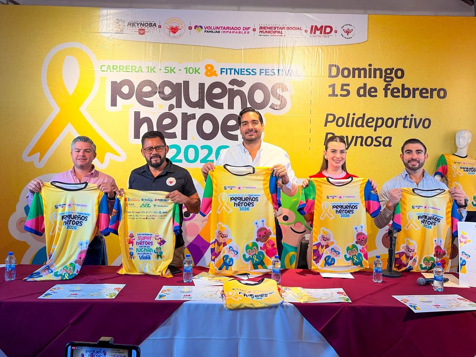 Reynosa, Tamaulipas.-El Alcalde Carlos Peña Ortiz y su esposa Alejandra Yelitza Garza dieron a conocer, acompañados por Jorge Mar Gea, Presidente de la Fundación Iluminando Corazones A. C., detalles importantes de la Carrera 1K, 5K, 10K y Fitness Festival Pequeños Héroes 2026 Reynosa, a celebrarse este domingo 15 de febrero a partir de las 7:00 de la mañana en el Polideportivo.