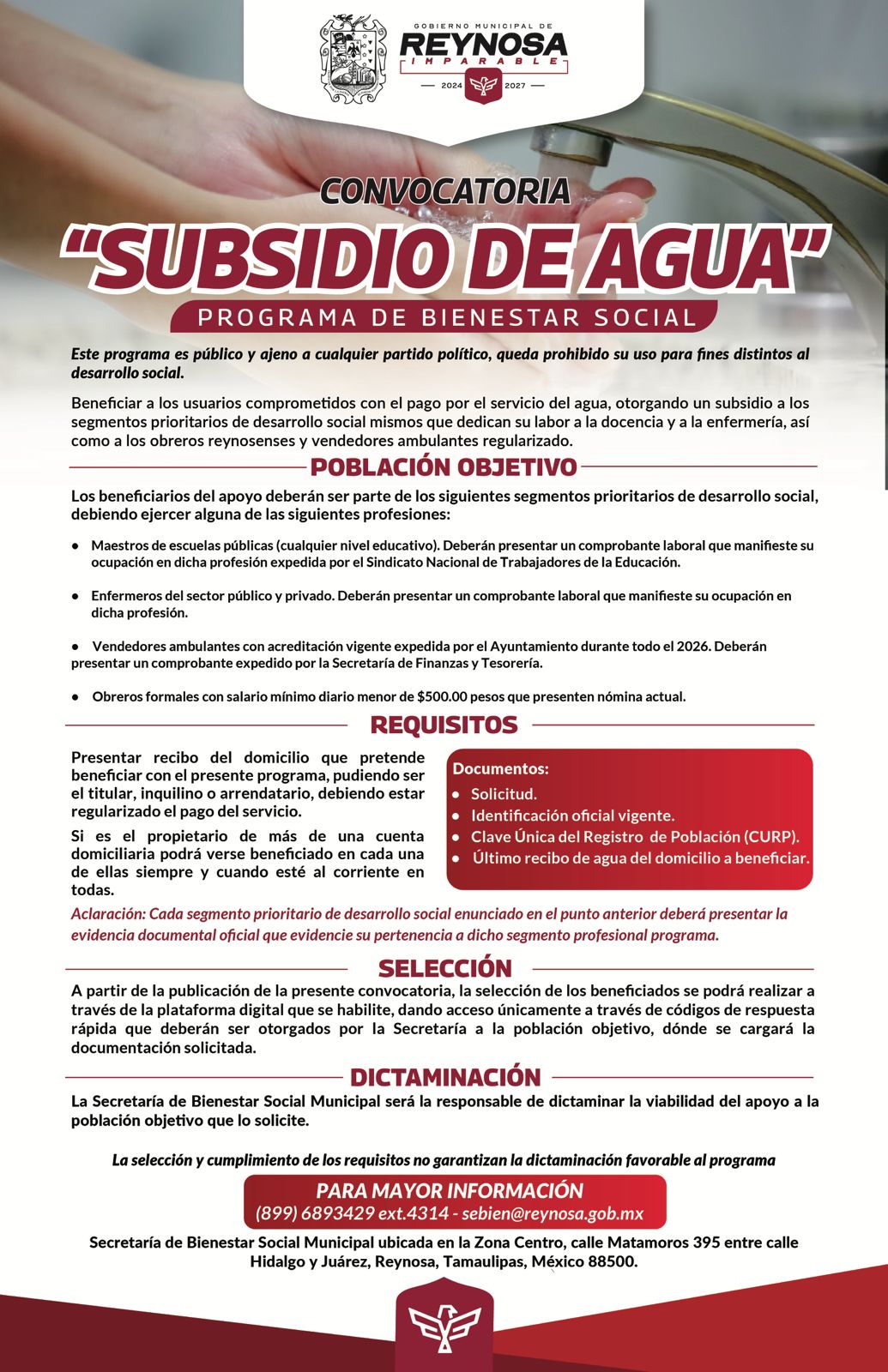 El Alcalde Carlos Peña Ortiz invita a los usuarios del servicio de agua potable, a participar en el programa municipal «Subsidio del Agua», estrategia social que busca apoyar la economía de Maestros de escuelas públicas, Enfermeros del sector público y privado, vendedores ambulantes acreditados por el Ayuntamiento y con pagos de derechos al corriente, y obreros formales con salario mínimo diario no mayor a 500.00 pesos, que se encuentren al corriente con su recibo de consumo.